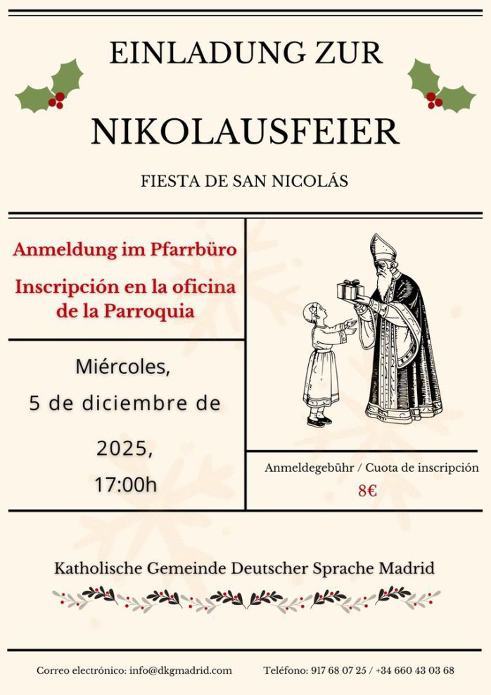 Jeden 3. Donnerstag im Monat trifft sich eine Gruppe um 20.00 Uhr in der Parroquia, um Deutsch zu sprechen. Wer möchte, ist schon um 19.30 Uhr zur heiligen Messe eingeladen.